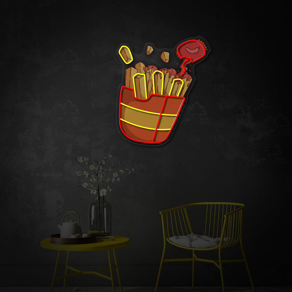 "Patatine fritte con salsa di peperoncino, fast food" Insegna al neon a LED stampata con UV